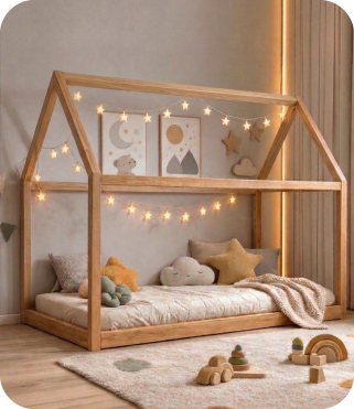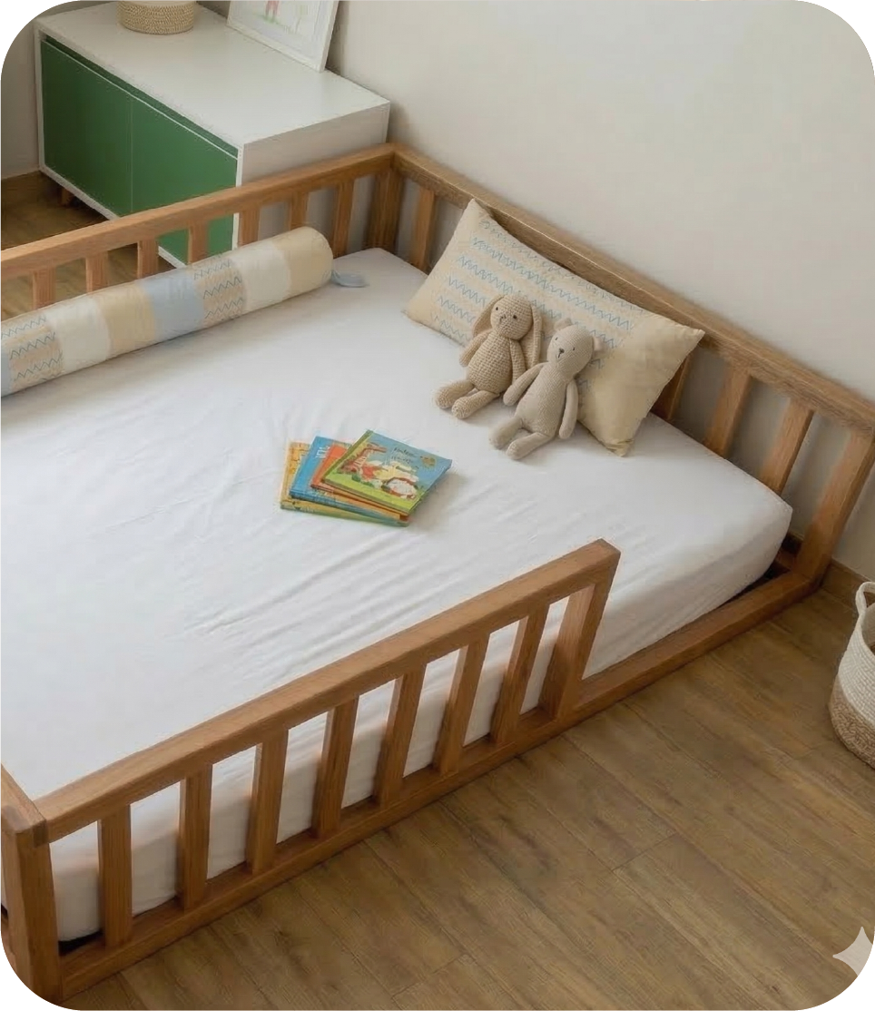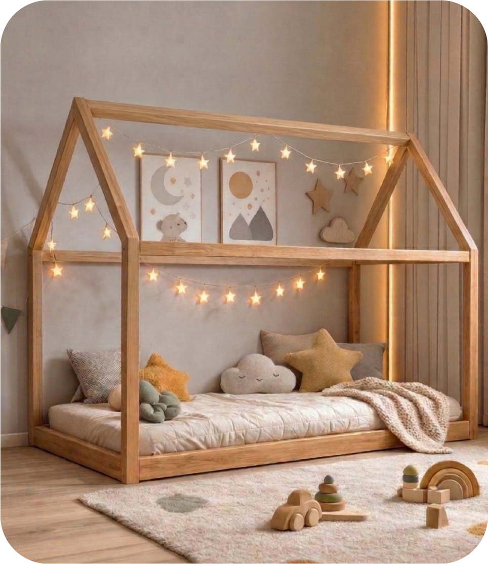 O ponto de partida para criar a cama perfeita. Nossa estrutura base é produzida em jequitibá maciço, com design montessoriano pensado para oferecer segurança, autonomia e durabilidade.