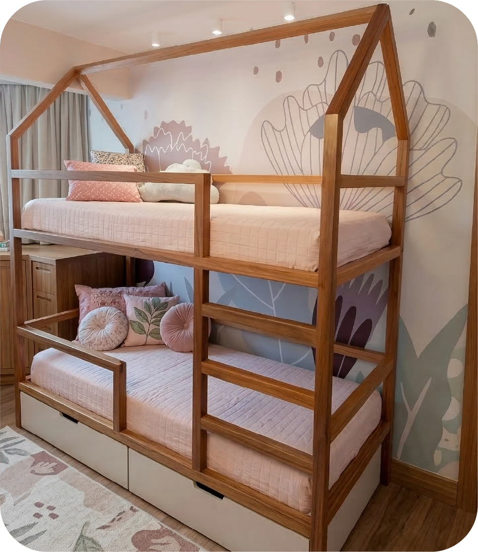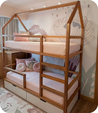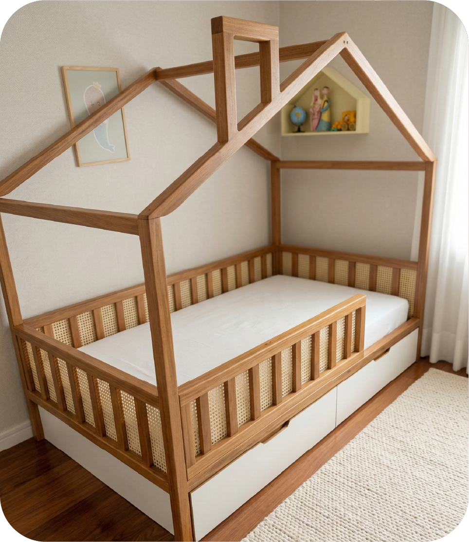 Fabricamos sua cama em madeira de Jequitibá, com acabamento premium e atenção total à segurança e durabilidade.